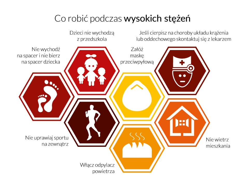 • unikać długotrwałego przebywania na otwartej przestrzeni dla uniknięcia długotrwałego narażenia na podwyższone stężenia zanieczyszczeń,