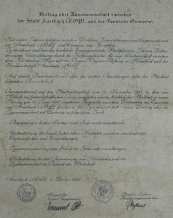 Gmina AuerbachW 1997 roku Gmina Oświęcim podpisała porozumienie o wzajemnej współpracy z bawarską Gminą Auerbach. Dwustronne kontakty mają na celu poznanie języka w środowisku rodzinnym partnera, zapoznanie się z historią i kulturą jego kraju, praktyki zawodowe, wymianę doświadczeń. Do podpisania porozumienia doszło dzięki wieloletnim kontaktom mieszkańców Auerbach z przedstawicielami Fundacji "Maja" oraz pracownikami i wychowankami Wioski Dziecięcej im. Janusza Korczaka w Rajsku.
