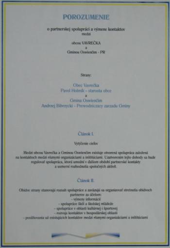 Gmina Vavrecka22 lutego 2002 roku nawiązano również współpracę ze słowacką Gminą Vavrečka.