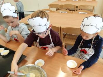 Podczas zajęć kulinarnych dzieci piekły babeczki. Z wielkim zaangażowaniem wykonywały kolejne polecenia, mieszały składniki, odliczały odpowiednie porcje składników, a po upieczeniu dekorowały swoje babeczki. Wszyscy z apetytem zjedli własnoręcznie wykonane smakołyki.