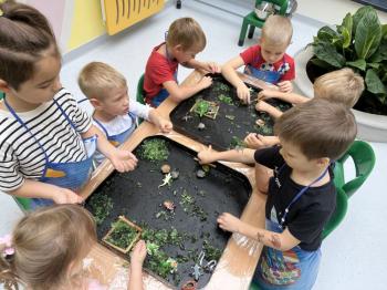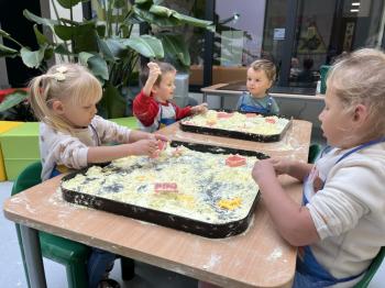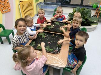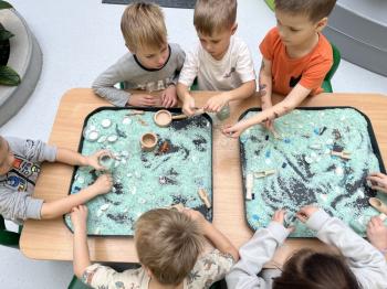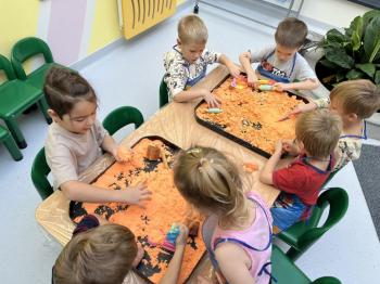 Dzieci odkrywały też „skarby ukryte w piasku”, rozwijając spostrzegawczość i cierpliwość. Nie zabrakło kreatywności – przedszkolaki same stworzyły ciastolinowe jeże oraz różnorodne jesienne pejzaże, wykazując się pomysłowością i zręcznością.