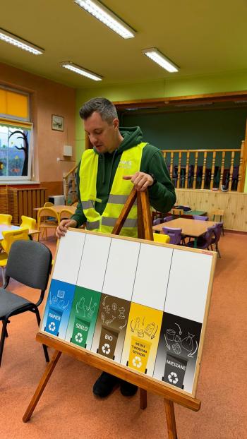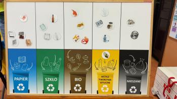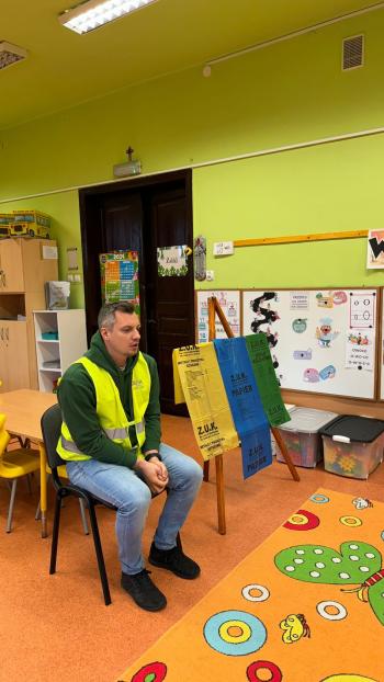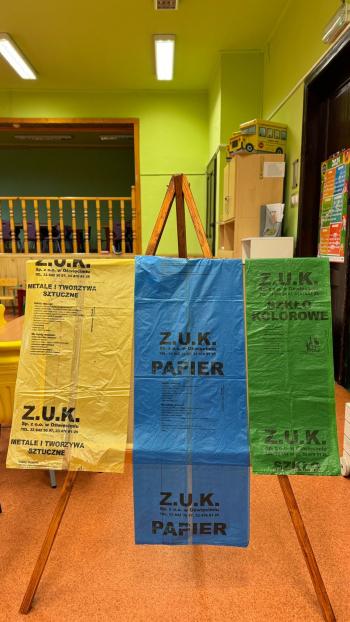 z zakresu edukacji ekologicznej z zakresu poprawnej segregacji odpadów komunalnych. Zajęcia zostały przeprowadzone we wszystkich grupach oddziału przedszkolnego w formie prelekcji prowadzonej przez pracownika Zakładu Usług Komunalnych Sp. z o.o. w Oświęcimiu – Kierownika Wydziału Gospodarki Komunalnej, Pana Szymona Stanaszka.