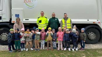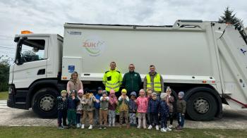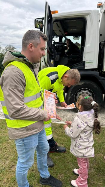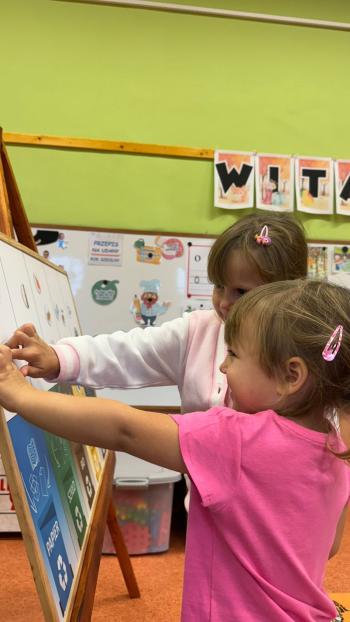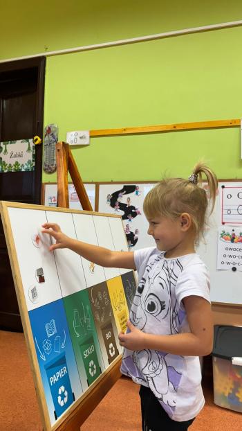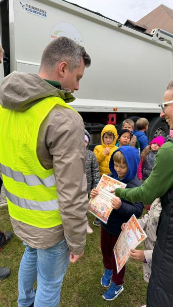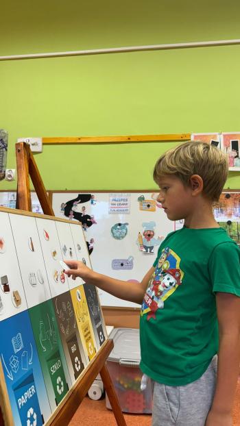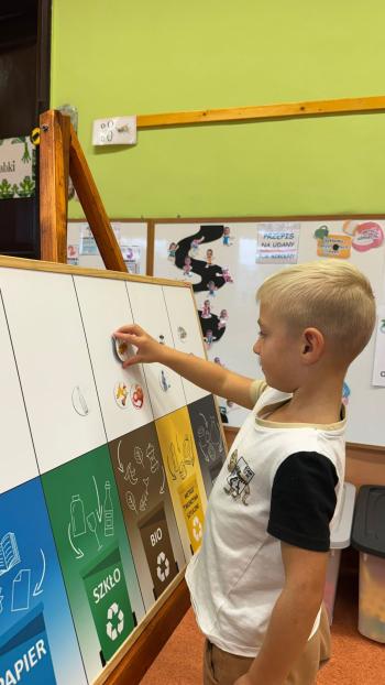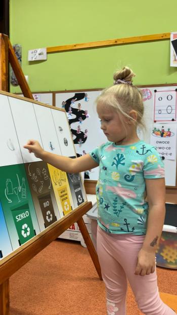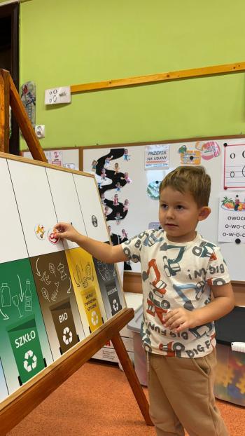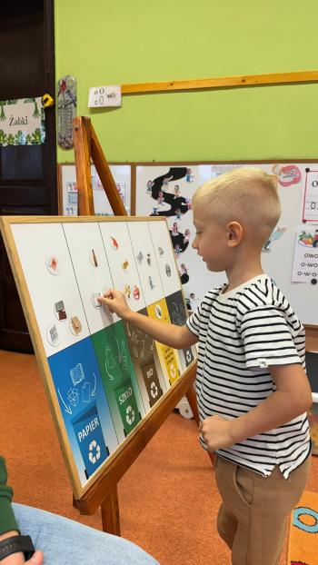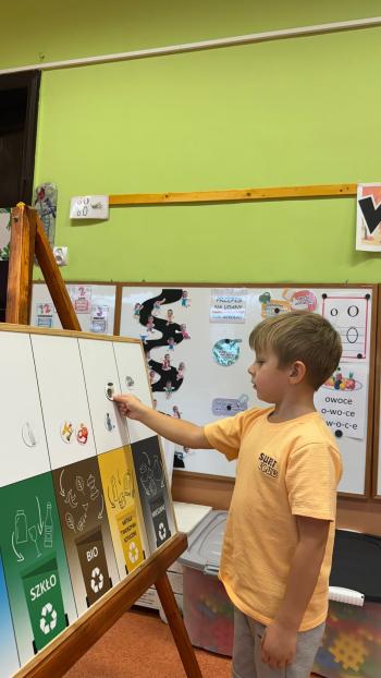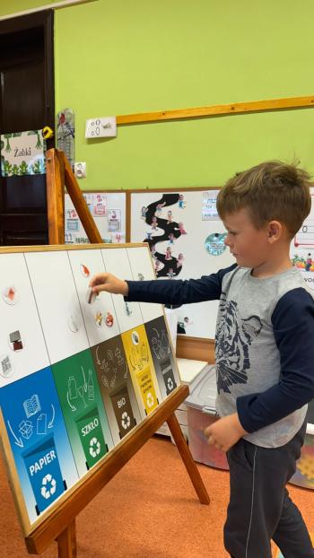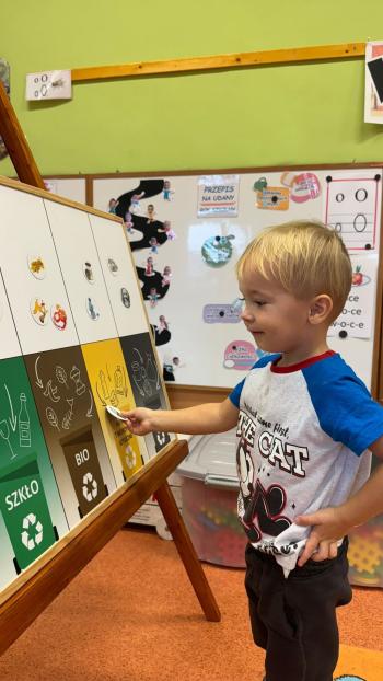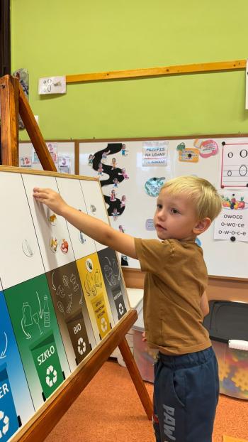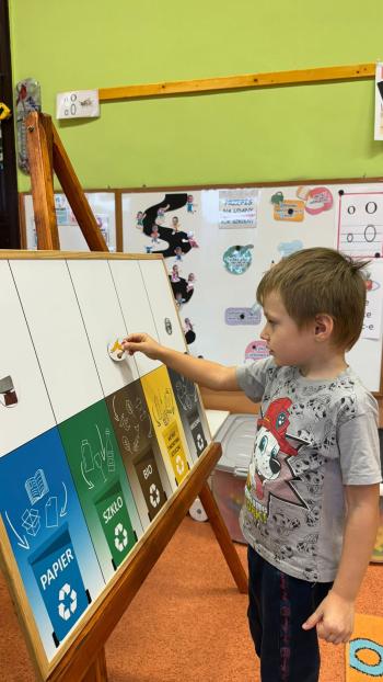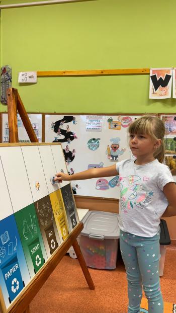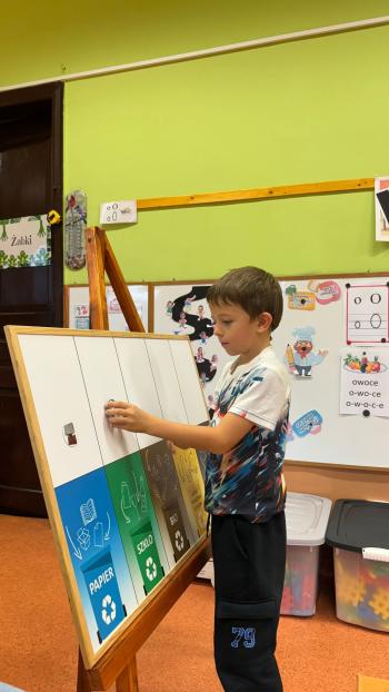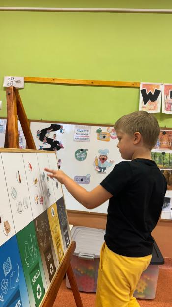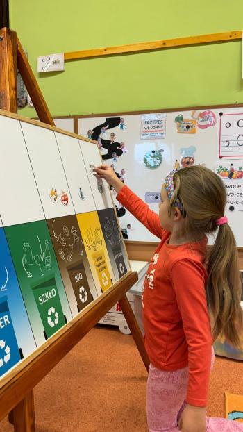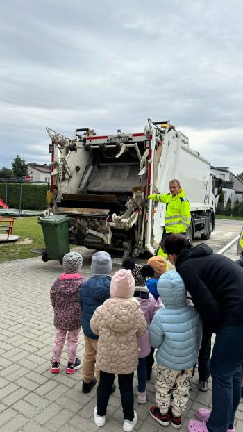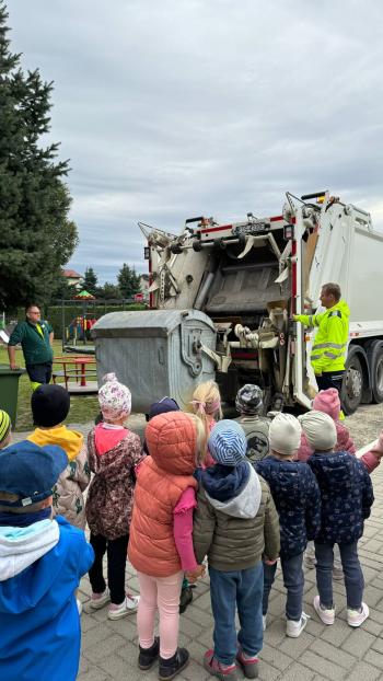 się o podstawowych zasadach segregacji i obowiązujących kolorach dla danego rodzaju odpadów. Prowadzący wykorzystał interaktywną tablicę z magnesami, na której znajdowały się kolorowe pojemniki, a dzieci po wysłuchaniu lekcji o prawidłowej segregacji miały za zadanie dopasować dane odpady do odpowiednich kolorów. Po zakończeniu części lekcyjnej, dalsza część prelekcji odbywała się na zewnątrz, a dzieci miały okazje z bliska zobaczyć i zapoznać się z działaniem śmieciarki. Chętni mieli szanse usiąść za kierownicą tego pojazdu.