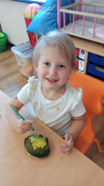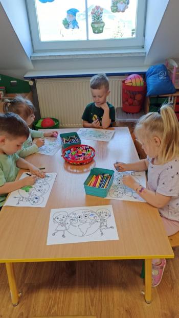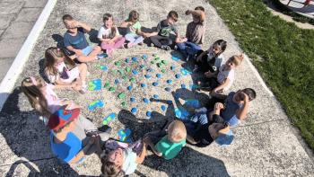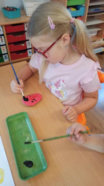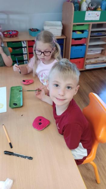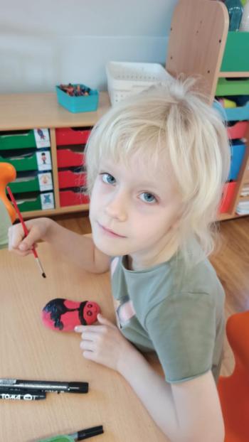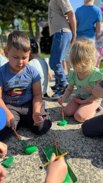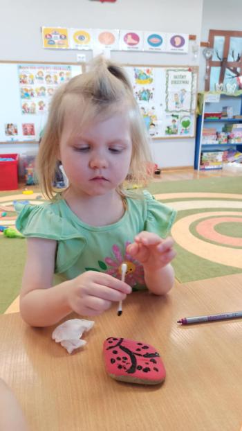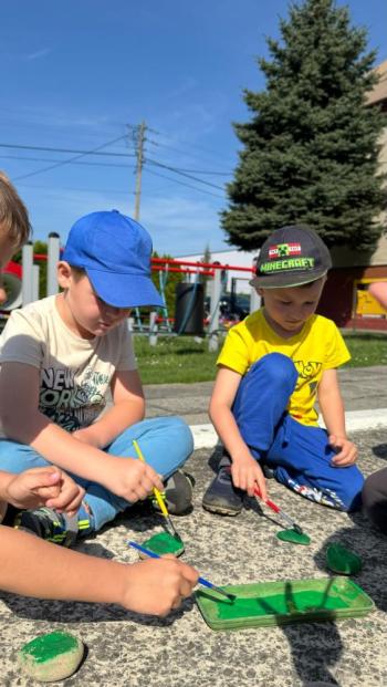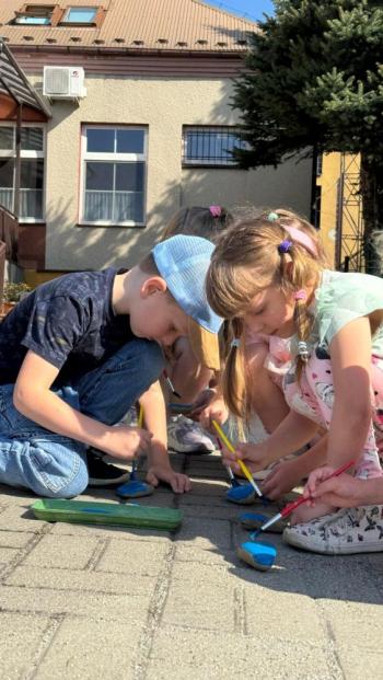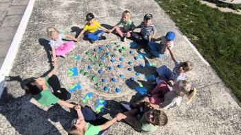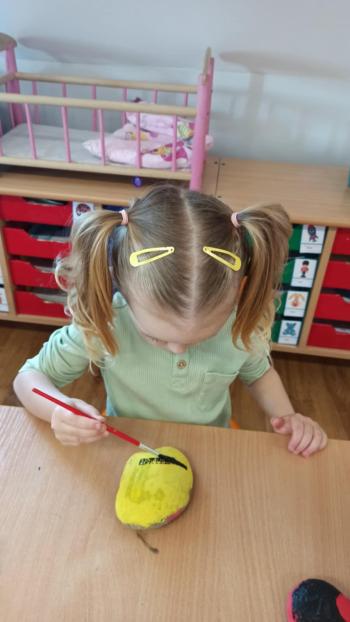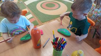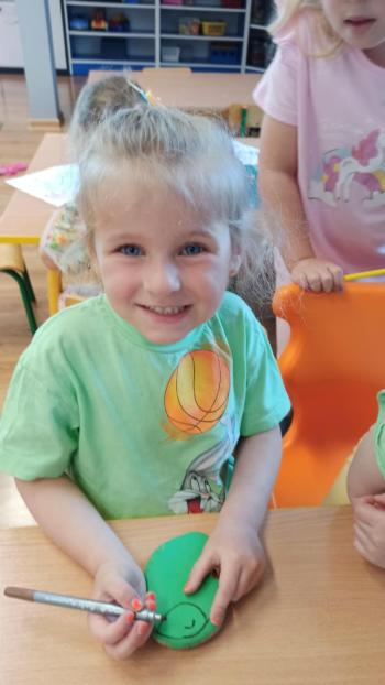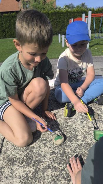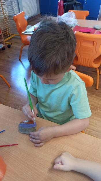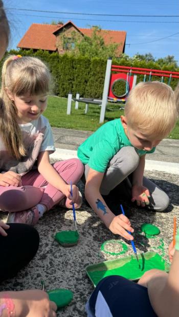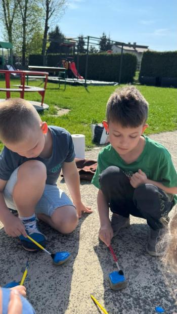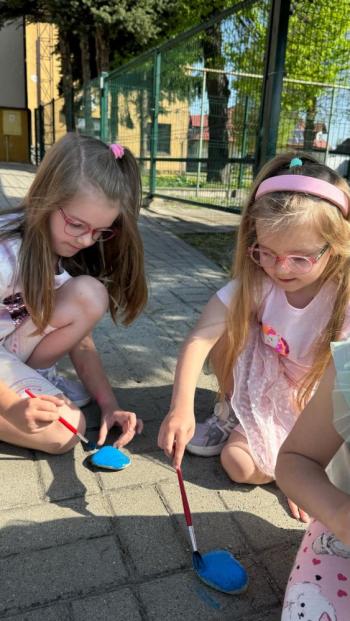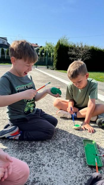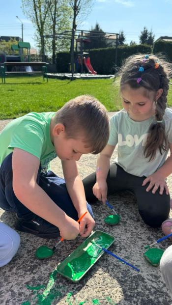 Maluchy oglądały plansze edukacyjne „Ziemia - naszym domem”. Poznały zasady ochrony środowiska naturalnego i działania takie jak: segregacja śmieci, oszczędzanie wody i energii elektrycznej. Następnie wykonywały prace plastyczne z wykorzystaniem kamieni. Malowały farbami otoczaki. Tak powstały „kamienne zwierzęta”. Starsze przedszkolaki obejrzały film edukacyjny na temat naszej planety - Ziemi. Dowiedziały się co jej grozi, jeśli nie zaczniemy o nią dbać, a także co robić, aby ją chronić. Stworzyły wspólnie z kamieni kulę ziemską, którą utworzyły na przedszkolnym podwórku. |