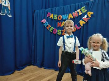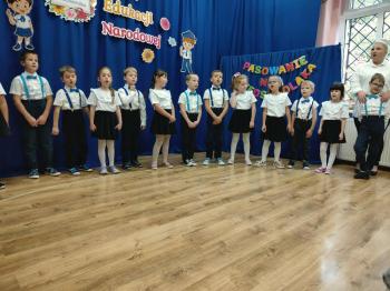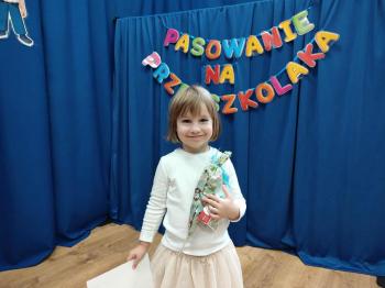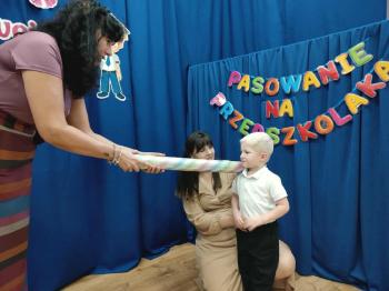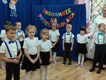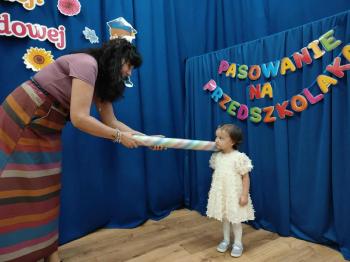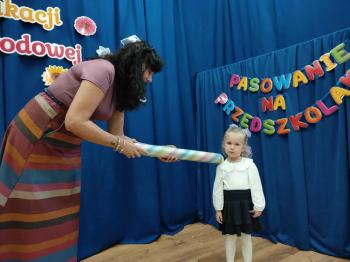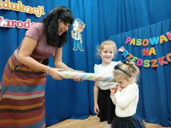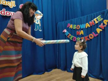 Najważniejszym momentem uroczystości było oczywiście Pasowanie na Przedszkolaka. Najmłodsze dzieci złożyły uroczyste przyrzeczenie, po czym pani dyrektor dokonała symbolicznego pasowania „czarodziejskim ołówkiem”.