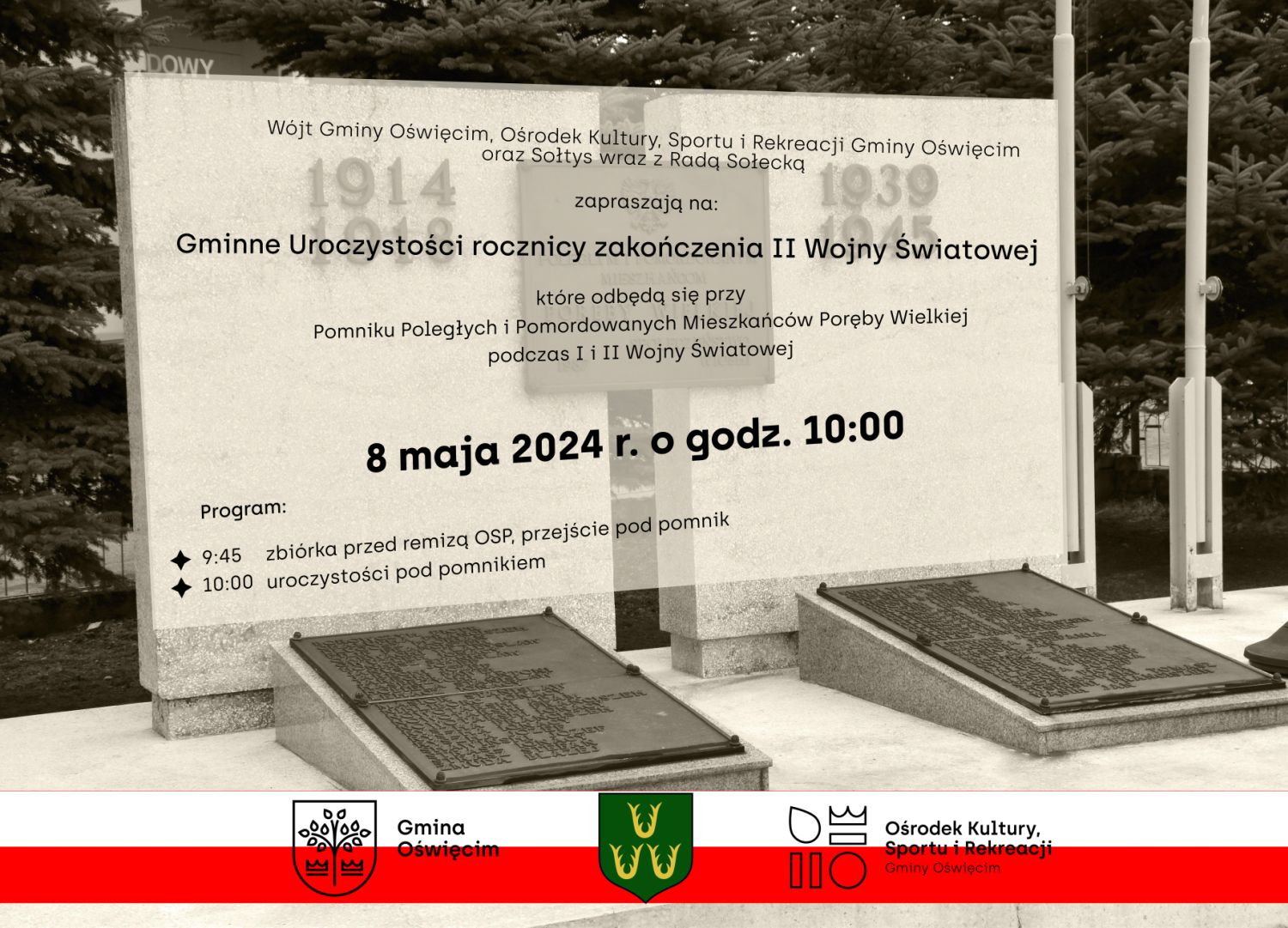 Zapraszamy na Gminne Uroczystości rocznicy zakończenia II wojny światowej, które odbędą się przy Pomniku Poległych i Pomordowanych Mieszkańców Poręby Wielkiej podczas I i II wojny światowej. Obchody: 8 maja br., godz. 10:00.